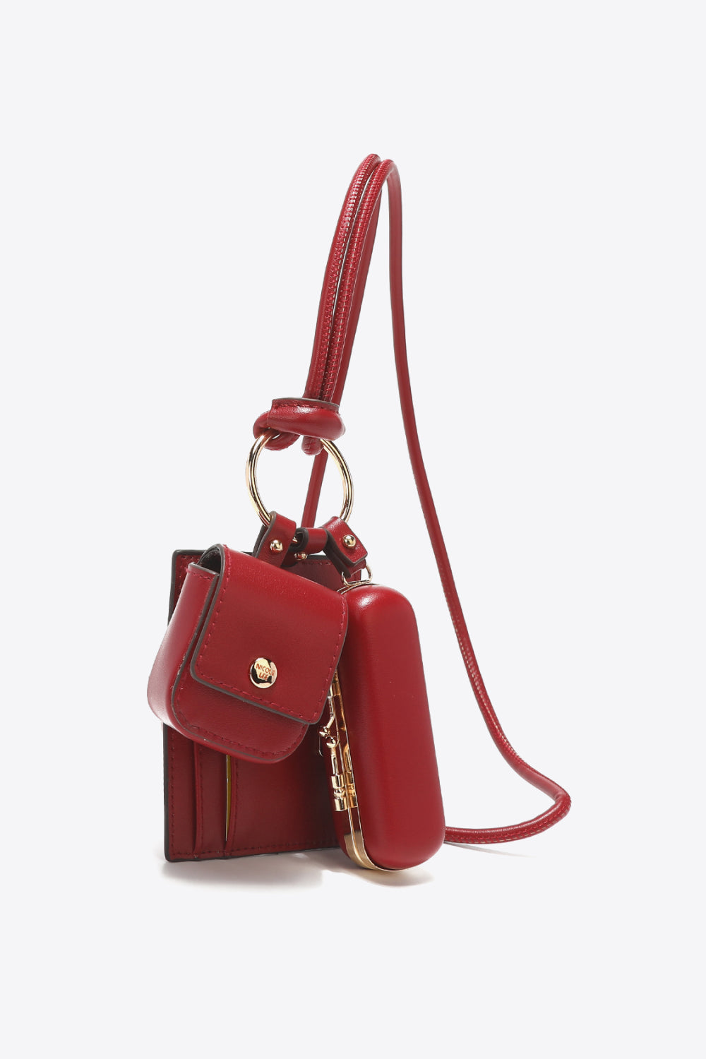 Designed to keep your essentials organized and within reach. Crafted with care, each piece in this set is made from high-quality vegan leather with a luxurious feel. With its thoughtfully designed features and stylish aesthetic, this set is perfect for those who value both functionality and fashion. The AirPods Case included in this set offers optimal protection for your precious earbuds. With its secure snap button closure, you can ensure that your AirPods or AirPods Pro are safely stored and easily accessible. The bottom cutout allows you to charge your case without compromising its protection. Sized at 2 inches in length, 1.5 inches in width, and 2.5 inches in height, this case is compact yet spacious enough to hold your AirPods securely. Our card case is designed with convenience in mind. It features two card slots, allowing you to carry your essential cards such as credit cards, ID cards, or transit passes with ease. With its compact dimensions of 4 inches in length and 3.25 inches in height, it effortlessly fits into your pocket or bag, making it an ideal accessory for when you're on the go. The lipstick case in this set combines functionality and elegance. It features a metal kiss lock closure, ensuring that your lipstick remains securely stored. The velvet interior lining provides a soft and protective cushion for your lipstick, preventing it from getting scratched or damaged. The interior mirror adds a touch of practicality, allowing you to effortlessly touch up your makeup. The lipstick case measures 1.25 inches in length, 1.25 inches in width, and 4 inches in height, making it the perfect size to carry your favorite lipstick. The set also includes a stylish lanyard with a 21-inch strap drop. The lanyard allows you to keep your essentials close by, whether you're attending an event, exploring a new city, or simply going about your daily activities. With its gold-tone hardware, it adds a touch of sophistication to your ensemble.