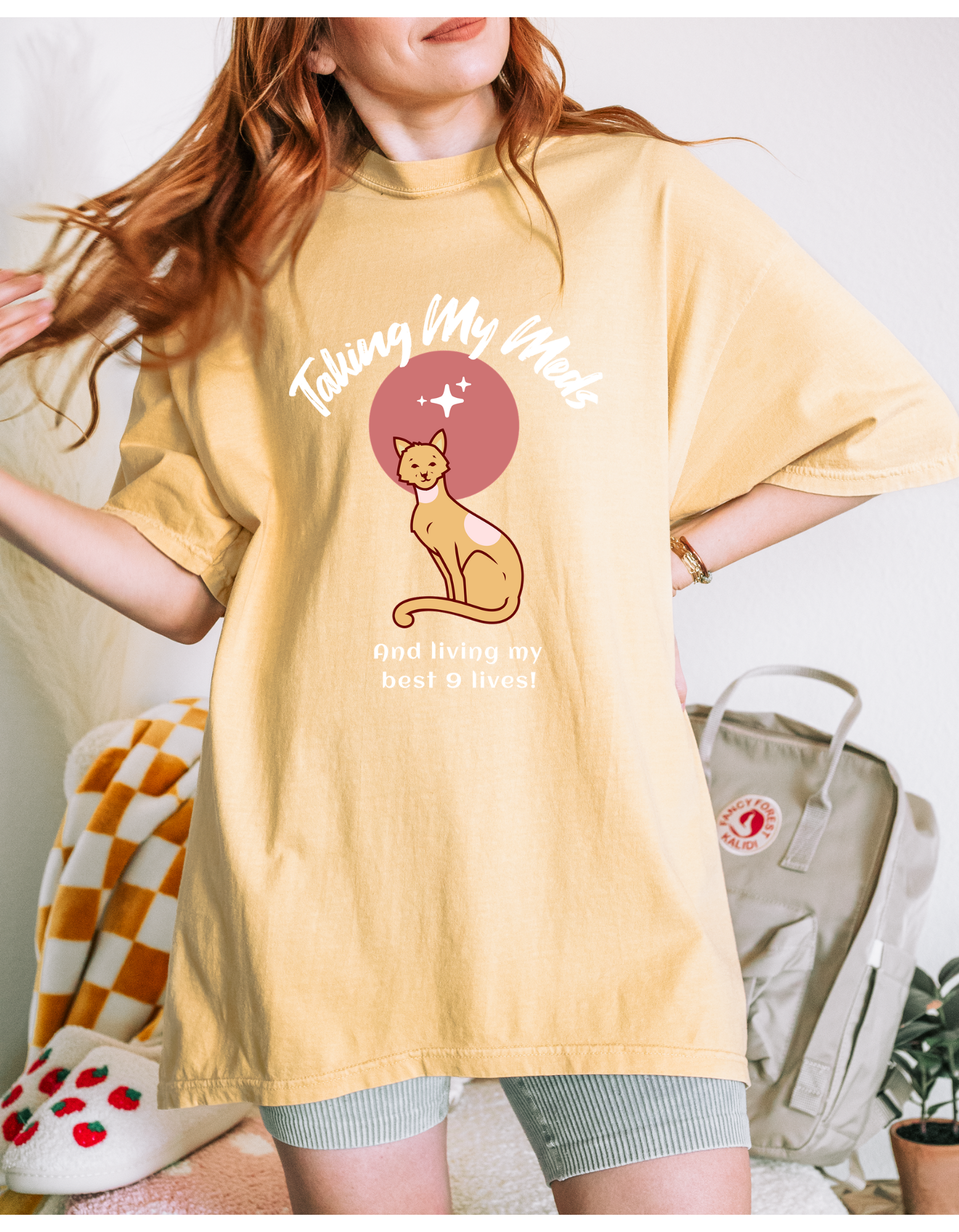 Our "Taking My Meds And Living My Best 9 Lives" T-shirt is more than just apparel; it's a symbol of strength, resilience, and the power of embracing your unique journey. Wear it proudly, inspire others with your cat-like resilience, and let your T-shirt be a reflection of your unwavering spirit.